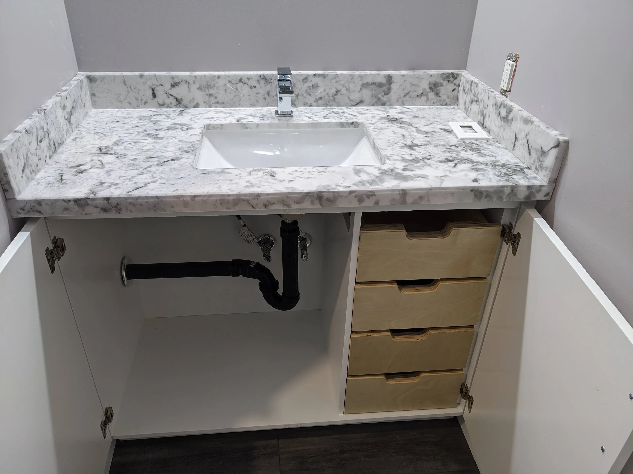 “True luxury is as functional as it is beautiful. Our bespoke vanities feature discreet internal storage systems-available in three or four-tier drawer configurations-hidden behind seamless custom doors. This tailored approach provides maximum organization while maintaining the clean, architectural lines of the Ancaster Standard.”