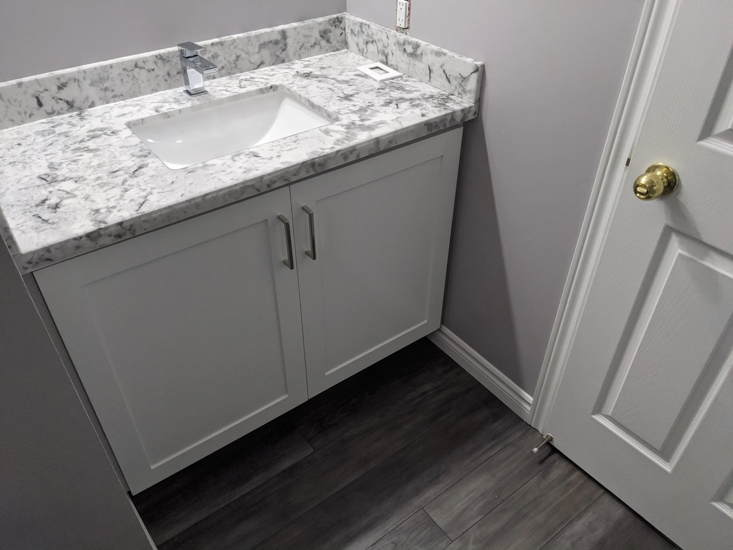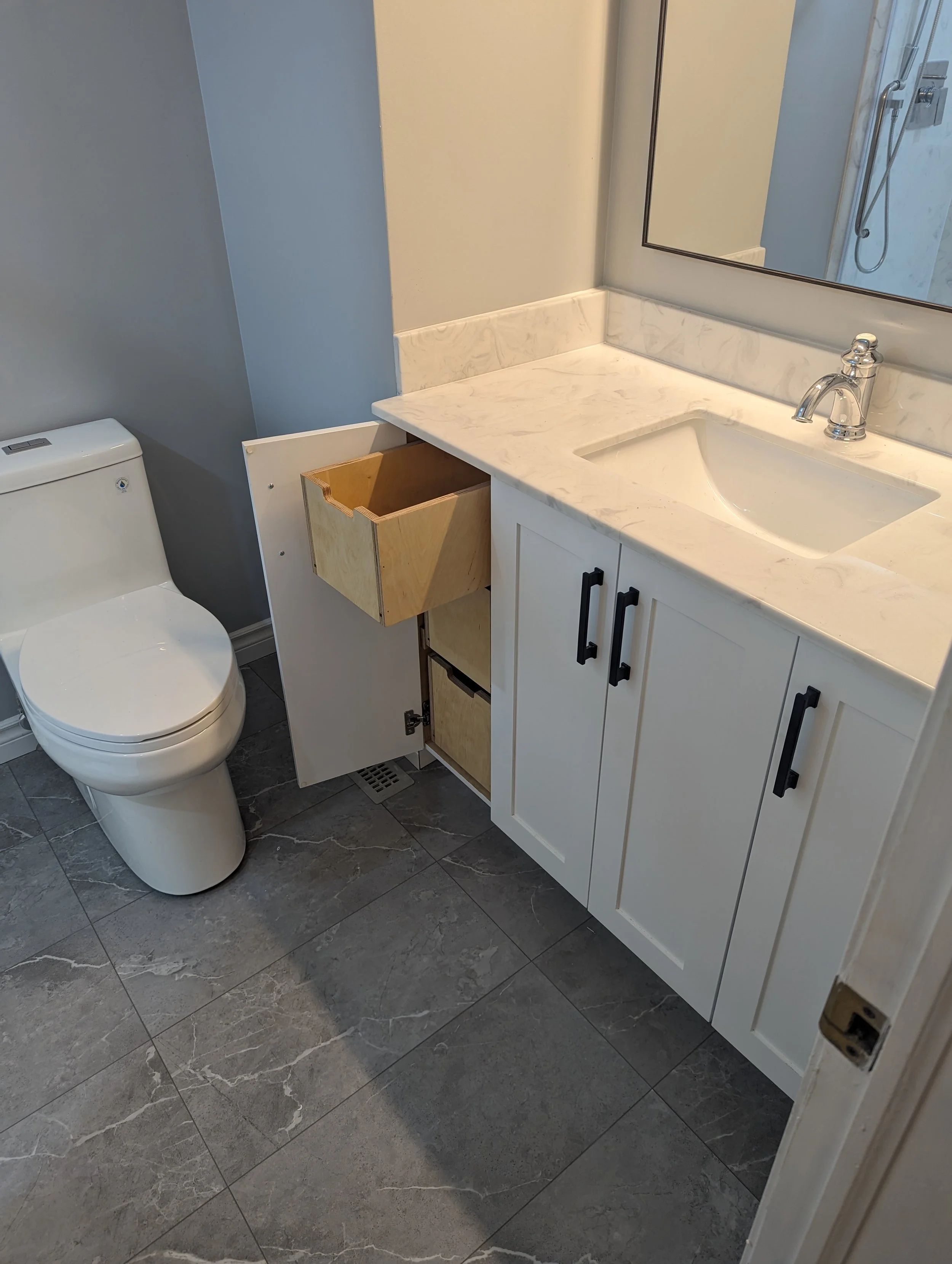 “A masterclass in modern spatial design and high-end finishes. This full ensuite overhaul features a seamless walk-in shower with floor to ceiling modern one piece shower walls, paired with a sophisticated deep-toned vanity and integrated farm-style basin. It represents our commitment to the verified 95%+ excellence score we’ve earned as Brantford’s top-rated cabinet shop.”