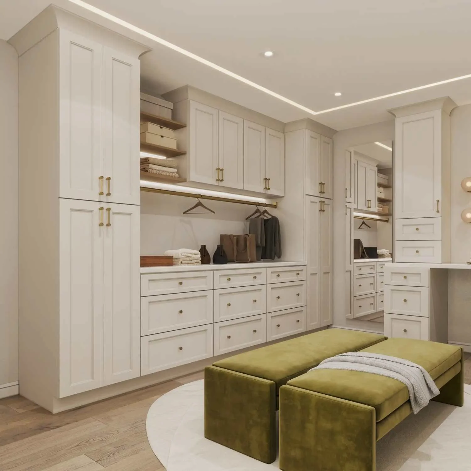Boutique Organization: Custom-integrated LED lighting and specialized pull-out systems, from accessory organizers to dedicated garment racks, create a truly tailored dressing experience.